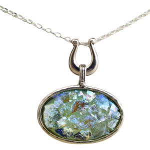 This beautiful pendant necklace was inspired by the traditional portrayal of King David's Harp, as discovered at a Temple Mount Sifting Project in the Emek Tzurim National Park. The oval pendant features shards of breathtaking historical Roman glass, which obtained their color from the Patina coloring process.