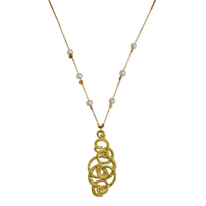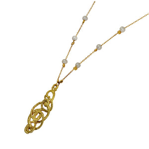 14K gold plated silver necklace with gold ornament pendant. The chain is embedded with six pearls. The pendant's design was inspired by a proto-Ionic capital, an impressive and large capital, which is considered the most beautiful of the capitals of its kind discovered to date in Israel. This impressive remnant was discovered on the slopes of Kiryat Hashalton (Area G) in the City of David, and undoubtedly adorned a majestic structure. The title dates to the tenth century BCE, so it may have adorned the Palace of the Kings of the House of David.