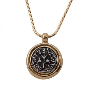 Half Shekel coin necklace is inspired by a coin from the late First Temple period. This coin, at the equivalent of half a shekel, was given as a donation to the Temple for the purchase of sacrifices offered on behalf of the whole nation. On the inside of the coin is a branch from which three pomegranates emerge and an inscription in ancient Hebrew: `Holy Jerusalem'; On the back is the inscription `Half Shekel`, in the middle of the back is the Omer Cup (from the vessels of the Temple) and above it is the letter A to mark the first year of the great rebellion against the Romans. The coin was found during a dirt sifting originating from the Temple Mount.