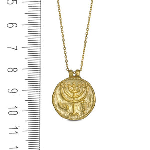 gold plated silver necklace. The pendant on this necklace was inspired by a 1400-year-old Jewish treasure that has recently been found. The rare treasure contained various coins and gold bars, but in addition also contained a large and beautiful pure gold medallion, along with a gold chain made by an artist with other small medallions - which was probably used as a jewel for a Torah scroll. On the medallion are stamped the temple lamp, shofar and Torah scroll, on the jewel are additional medallions with ornaments.