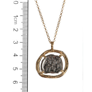Feel holy and pure with this 'Pure for God' coin pendant necklace. Inspired by a tiny seal with the Aramaic inscription 'Daka LeYa', meaning 'Pure for God', which was discovered during archeological excavations, and dates back to the Second Temple, this coin is believed to have attested to the purity of the gift brought to the Temple. The necklace's unique design features an outer Gold-plated circle, with a Sterling Silver coin with an Aramaic inscription.