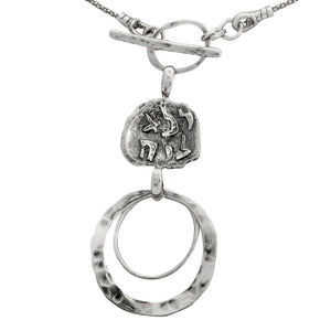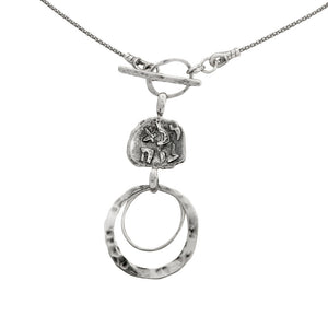 Embrace purity and history with this 'Pure for God' silver hoop necklace. Exquisitely designed with a double hoop suspend from a front-clasp pendant, and featuring a seal with an Aramaic inscription, this necklace is a true masterpiece. The seal was inspired by the famous seal found during archeological excavations, with the Aramaic inscription of 'Deka LeYa', meaning – Pure for God. It is believed the seal was used to attest to the purity of the gifts brought to the Holy Temple.