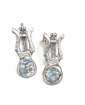 Surprise your loved one with this timeless pair of silver harp-shaped earrings, made with Roman glass. Inspired by an ancient harp-shaped ornament discovered at the Temple Mount Sifting Project at the Emek Tzurim National Park, these earrings present a meaningful, historical vibe.
