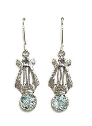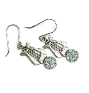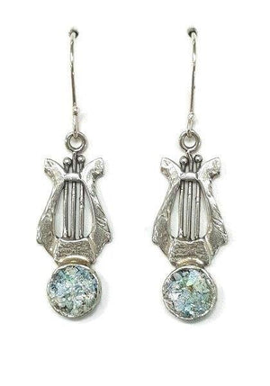 Enjoy this beautiful pair of harp-shaped pendant earrings with a circle of Roman glass, which combine the history of the Roman Empire, with the history of King David.
