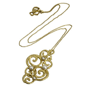 This silver necklace is plated with 14K gold and bears a spiral designed golden pendant set with four white pearls. The piece was inspired by an ancient, intricate capital which once stood at the top of a support pillar in one of the palaces of the second Temple period. This capital was found in the City of David and there are those who ascribe it to King David's palace.