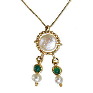 Queen Helene “pearl earring” necklace made with 14K gold, white pearls, and agate. The pendant’s design comes from an ancient earring that was uncovered during excavations in the City of David area. The earring was found inside a structure from the Byzantine era but experts believe that is was crafted 300 years earlier during Roman rule (Second Temple period) and was a family heirloom. It was uncovered in area where the nobility of Jerusalem lived at the time.