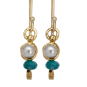 This is a pair of small gold plated silver earrings incorporating white pearls and turquoise aqua quartz gemstones. The earring’s design was inspired by the bottom half of a larger earring found by archaeologists in the depths of the earth of ancient Jerusalem. Experts believe that this style was the height of fashion during the Second Temple period.