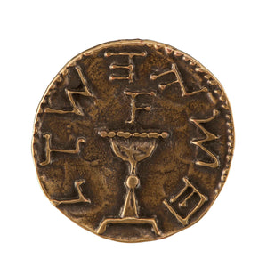 The Half Shekel coin is inspired by a coin from the late First Temple period. This coin, at the equivalent of half a shekel, was given as a donation to the Temple for the purchase of sacrifices offered on behalf of the whole nation. On the inside of the coin is a branch from which three pomegranates emerge and an inscription in ancient Hebrew: `Holy Jerusalem';